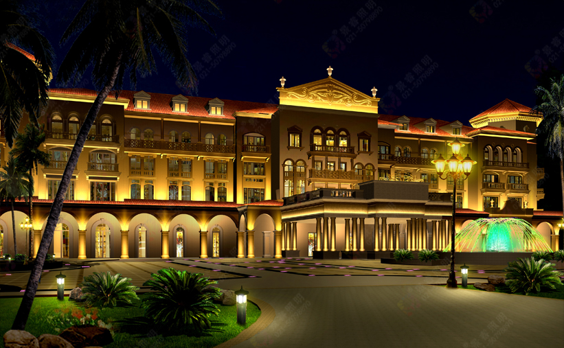 九龍山度假村燈光照明設計在構思上,緊扣主題,由建筑物底部層次向頂部照射,突出建筑物的立體感,充分體現建筑物設計的價值,注重建筑立面的效果,具有鮮明的個性化和層次感。首先將建筑視覺上的特征作為泛光照明工程重點刻畫區。從整個建筑區域外形和結構考慮,主要分為三個層次表現,底部埋地的照明為第一層次;小型投光燈照明效果為第二層次;頂部照明為第三層次。這樣視覺下由上往上形成堅直有力,晶瑩透亮,由強減弱,層次分明的LED照明效果,使整個建筑物在夜色中熠熠生輝立體感極強。其次在燈光工程藝術處理技法的巧妙運用。在燈光設計中,大膽采用光色分區、亮度對比、光影對比、燈光的流動和靜止等藝術處理技法,體現出藝術的美感。下往上照度逐漸降低,再到頂部局部的突出,光源選用不同的色溫。主樓部分采用暖色調投光燈照射。立柱處及頂部采用暖色調光照明,體現了光影對比,勾勒建筑特征。