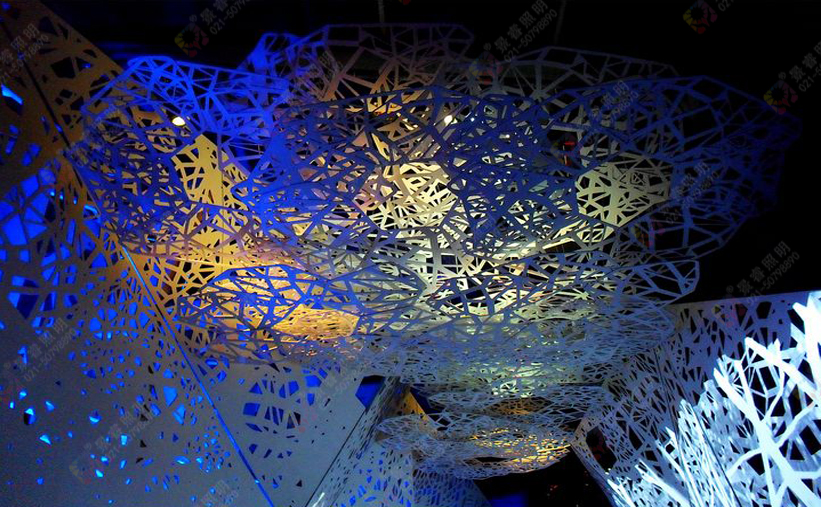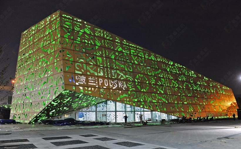 上海世博會波蘭館位于浦東園區C片區,該燈光工程占地3000平米,波蘭館展館外形抽象且不規則,表面布滿鏤空花紋,仿若民間剪紙,使參觀者獲得有趣的視覺體驗。