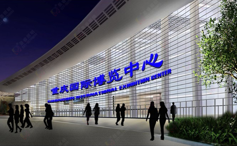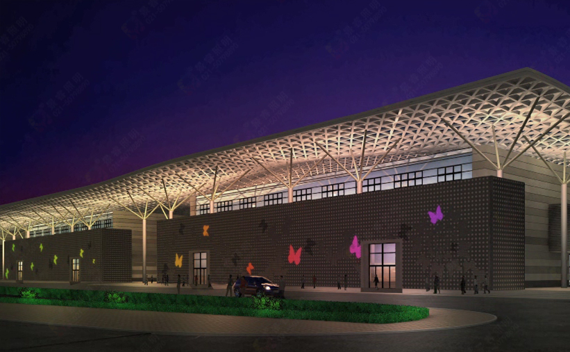景睿照明在重慶國際博覽中心的燈光設計上,決定在該建筑立面蝴蝶造型采用LED點光源,夜晚可見彩蝶翩翩起舞的照明設計效果。大面積的屋檐底面使用白光LED投光燈照射,整個屋檐底面如白玉一般,其反射光又可增加地面照度。屋面輪廓及屋面蝴蝶斑點使用LED動態彩色線條燈勾勒,屋面安裝LED照明星空燈,整體采用DMX512控制,燈光工程系統運行時,如蝴蝶扇動兩翅膀,翅膀上波光鱗動,美不勝收。