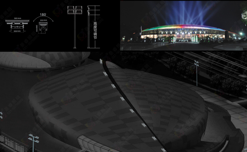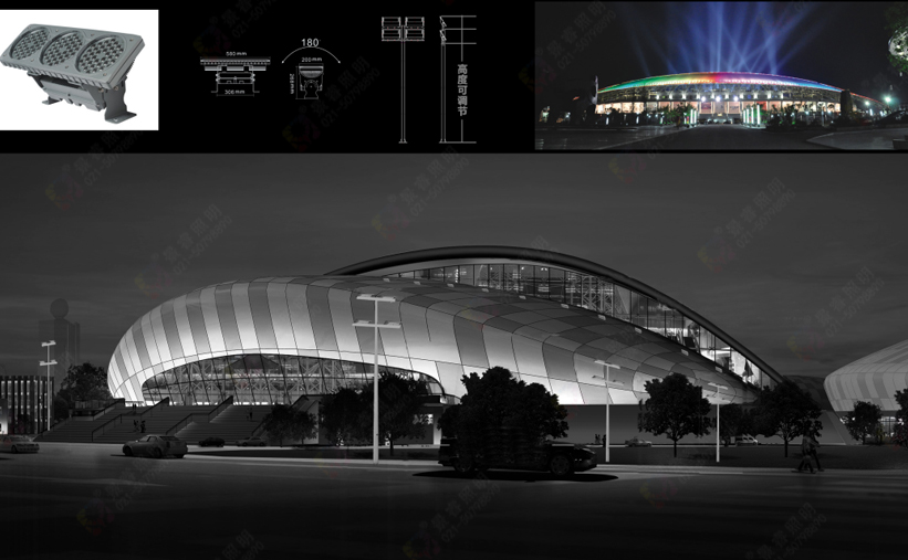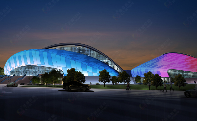 體育館燈光工程以大范圍的投光LED照明為主,渲染建筑輪廓,整體變色控制,色彩豐富具有活力。燈具安裝于建筑外圍空地,不會破壞建筑本身結構。游泳館造型與體育館類似,所以燈光工程與體育館呼應,采用投光的照明設計方式,結構內(nèi)透,烘托場館靈魂、飄逸的燈光氛圍。