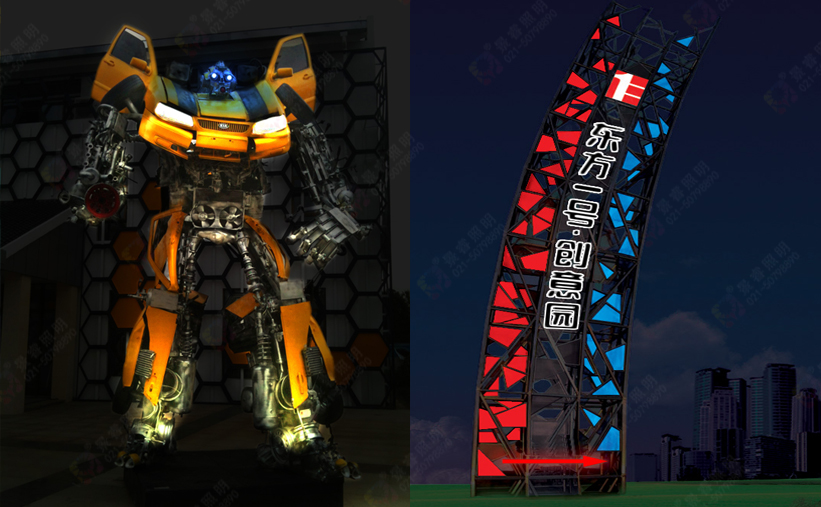 LOGO雕塑、精神堡壘雕塑、變形金剛大黃蜂雕塑等的燈光根據造型設計,極具時代氣息。