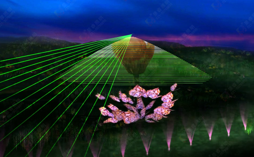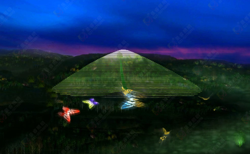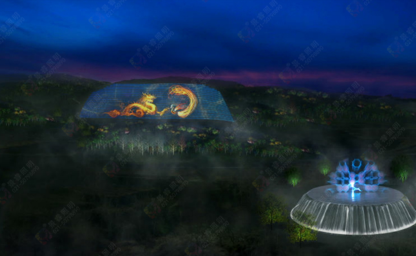 景睿照明設(shè)計(jì)師綜合考慮項(xiàng)目背景,采用多媒體燈光秀演繹,同時(shí)山體暗藏特制LED照明燈具,形成山體屏,播放段村歷史故事情節(jié);利用水潭的水形成水霧,演繹水幕燈光秀,再現(xiàn)龍飛鳳舞情景;水潭內(nèi)四周暗藏水霧噴嘴,形成水霧,通過(guò)染色燈營(yíng)造虛幻縹緲的場(chǎng)景來(lái)襯托龍鳳主題。