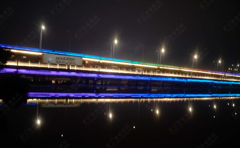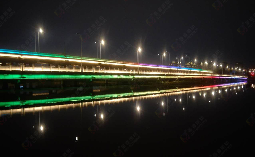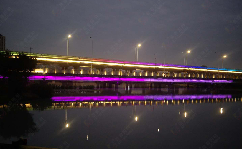 甌海大道南輔道橋燈光和主線甌海大道燈光基調(diào)保持一致又有變化。橋護(hù)欄使用3000K色溫12W洗墻燈照射,橋護(hù)欄立柱采用3000K小功率LED投光燈照射;橋側(cè)面采用彩色動(dòng)態(tài)洗墻燈;橋墩兩側(cè)使用3000K色溫18W洗墻燈照射。夜晚,大橋猶如一條巨龍橫跨濕地公園靜寂的湖面,美不勝收。