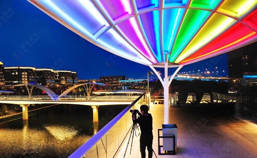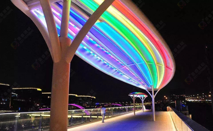 小淶港水系、北橫涇水系、北潮港水系,緊鄰會展中心,夜景燈光改造范圍從建虹路到楊虹路,全長1350m。這里將對沿河的防護欄桿安裝扶手燈,并在蘇虹路、錫虹路等跨小淶港橋下方增設景觀燈。