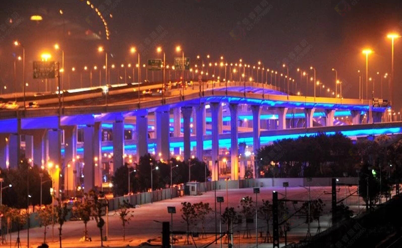 針對橋身運用燈光多變的色彩和緩慢的韻律感,體現橋身連續流暢的線條美;燈光可以根據不同時間、不同時節、不同主題進行變化,增加進口博覽會召開的熱烈氣氛。整體高架路從縱橫向上都有光和光帶來的層次,與車來車往川流不息的速度感相媲美。