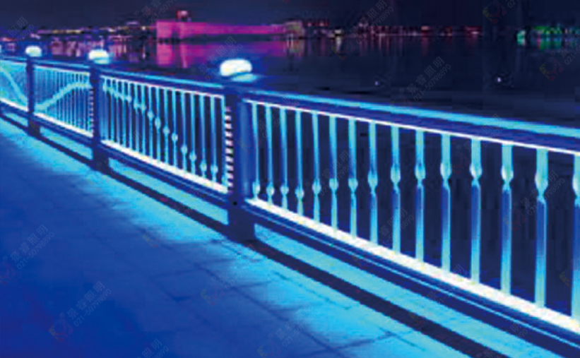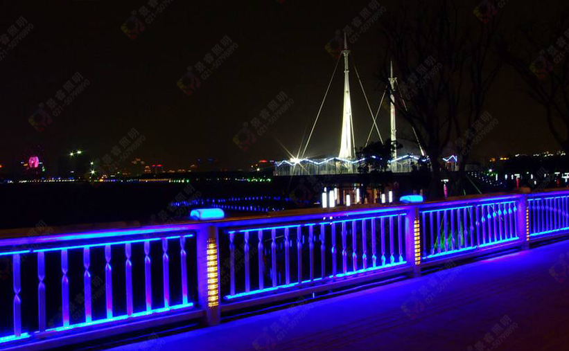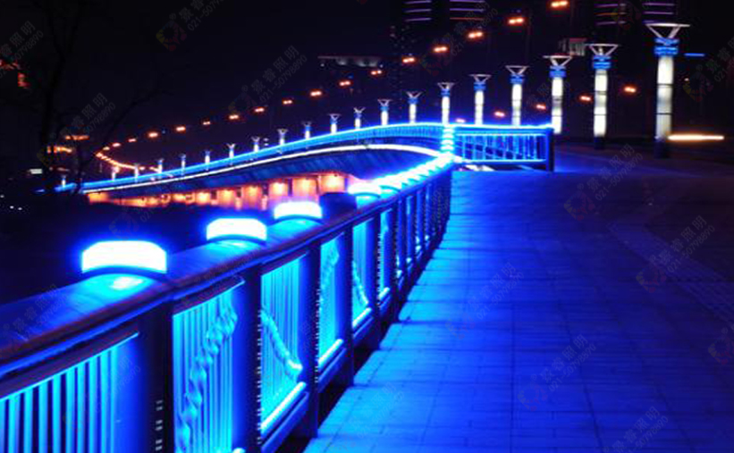 我們主要采取了以下兩方面整改措施:原有的白色LED樹脂桿頭燈拆除,重新設(shè)計并安裝藍寶石LED點狀燈具;增加蘭色小功率線形洗墻燈,將大橋高度約800mm、寬40mm的不銹鋼欄桿洗成蘭色,并突出欄桿扭曲的節(jié)點。