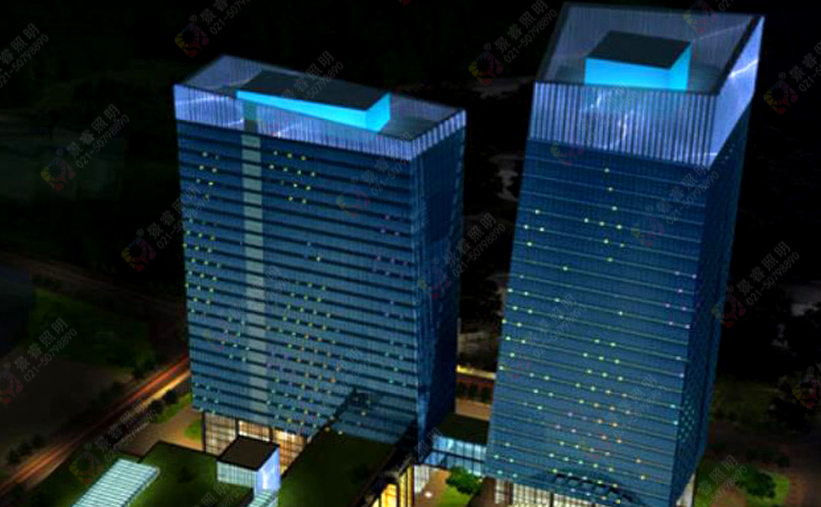 建筑主樓為幕墻框架結構,根據立面幕墻框料橫向逐層安裝LED動態全彩線條燈,由DMX512控制,建筑群整體變化,表現民營企業多彩多姿的行業、發展、生活。頂部燈光根據幕墻框料豎向向兩翼展開,動態燈光不斷向上和天際線融合,代表民營企業奮發向上、不斷拼搏的精神。