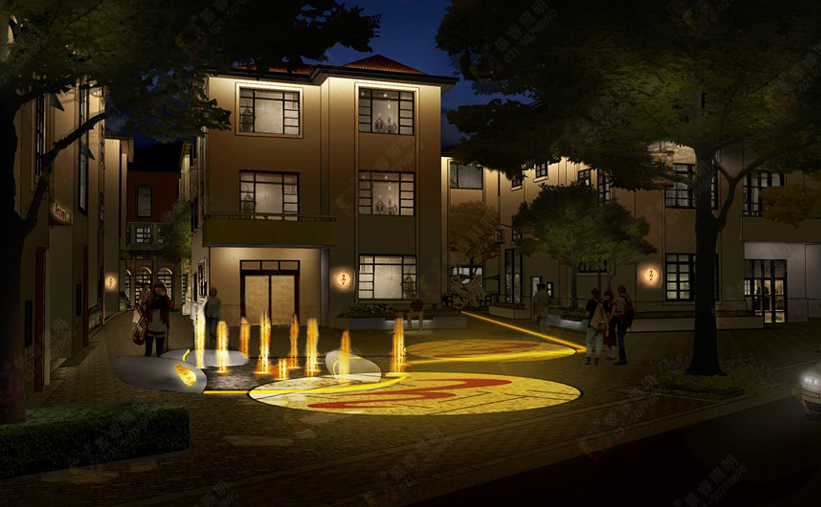 景觀(guān)照明分為尋游光帶、旱噴+雕塑坐凳、水景小品、8#前木平臺(tái)、后街圍墻+坐凳、臺(tái)階、植物、雕塑+老樹(shù)樹(shù)池,因地制宜、各具特色。