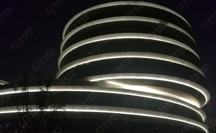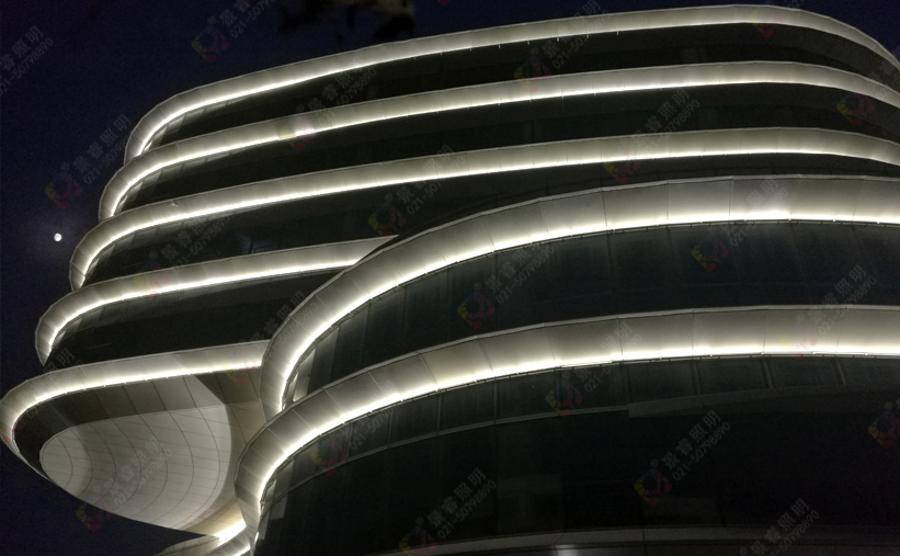 燈光亮化主要部位是1#至5#工業廠房。此建筑群體造型獨特,棟與棟之間全部有連廊連接在一起,精美的流線,形成了一條條長長的飄帶。此外墻燈光照明包含了外墻照明配電及控制系統,包含所有材料燈具配電系統采購安裝及調試。燈光設計的理念是建筑體外立面采用4000K色溫的LED外控洗墻燈,全部連接在一起,隨建筑飄帶布置,使建筑晚上的效果和白天一致。