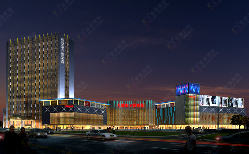 裙樓燈光設(shè)計(jì)盡量利用商鋪的內(nèi)透光、廣告位燈光、LED屏燈光,以減少建設(shè)成本。裙樓頂部蓬結(jié)構(gòu)采用雙層湖藍(lán)光色LED線條燈勾勒,蓬支撐立柱及蓬底面使用黃光LED投光燈照射,兩種色彩對(duì)比,凸顯結(jié)構(gòu)。立面安裝白光大型LED照明十字星燈,造型簡(jiǎn)潔明快,無(wú)論白天外觀,還是夜晚燈光,都與建筑融為一體。主入口照明設(shè)計(jì)為沿幕墻結(jié)構(gòu)豎向框料及側(cè)面幕墻裝飾預(yù)留燈光槽安裝LED動(dòng)態(tài)彩色線條燈,由DMX控制,以增加商業(yè)氣氛。
