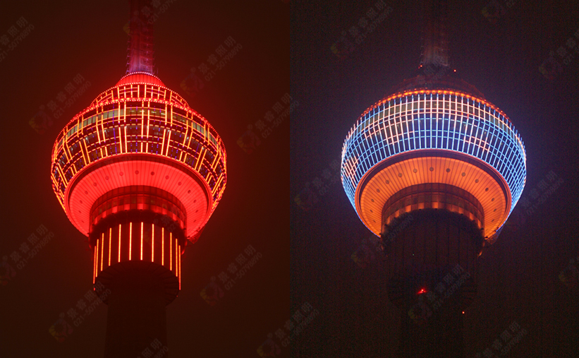 改造前,中央廣播電視塔大量采用傳統鎂耐燈和PAR燈進行建筑外立面裝飾,所有光源均采用鎢絲通電發光,能耗較大,原來的總工耗約為400KW;改造后,大部分燈具改用了LED光源,不僅燈光變換效果得到了極大的豐富,同時也大大降低了能耗,改造后,景觀照明系統總功率約為200KW;