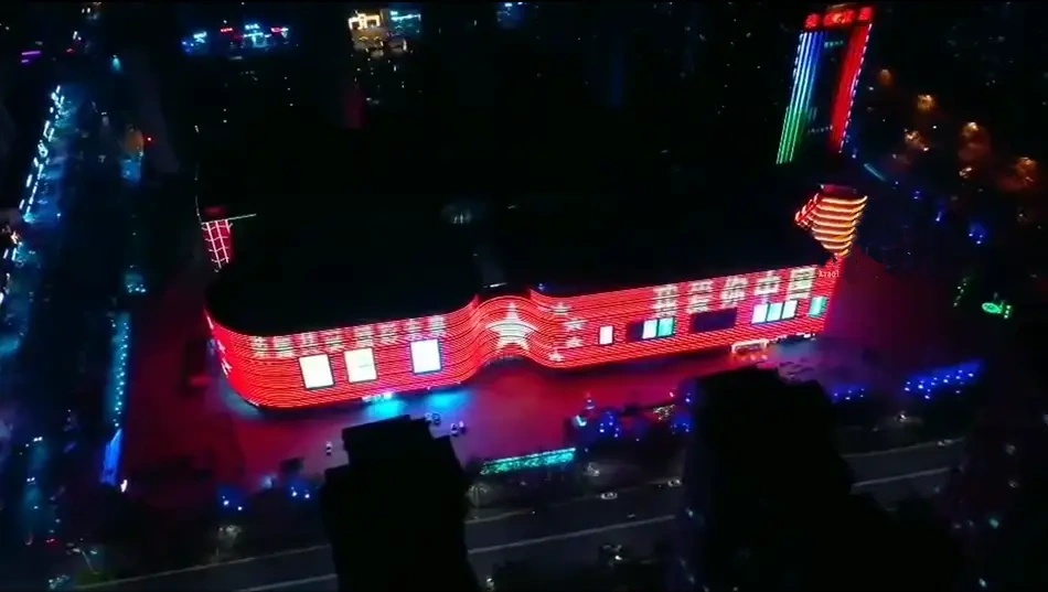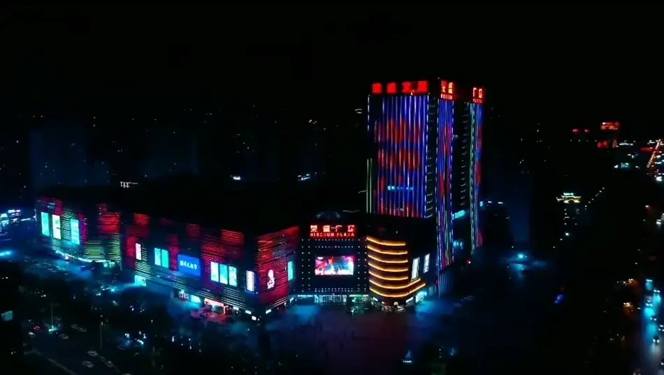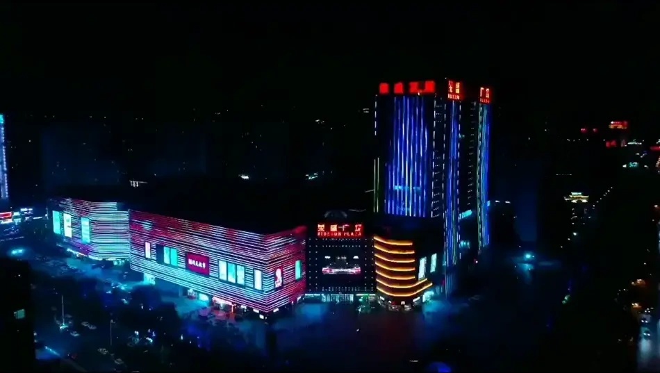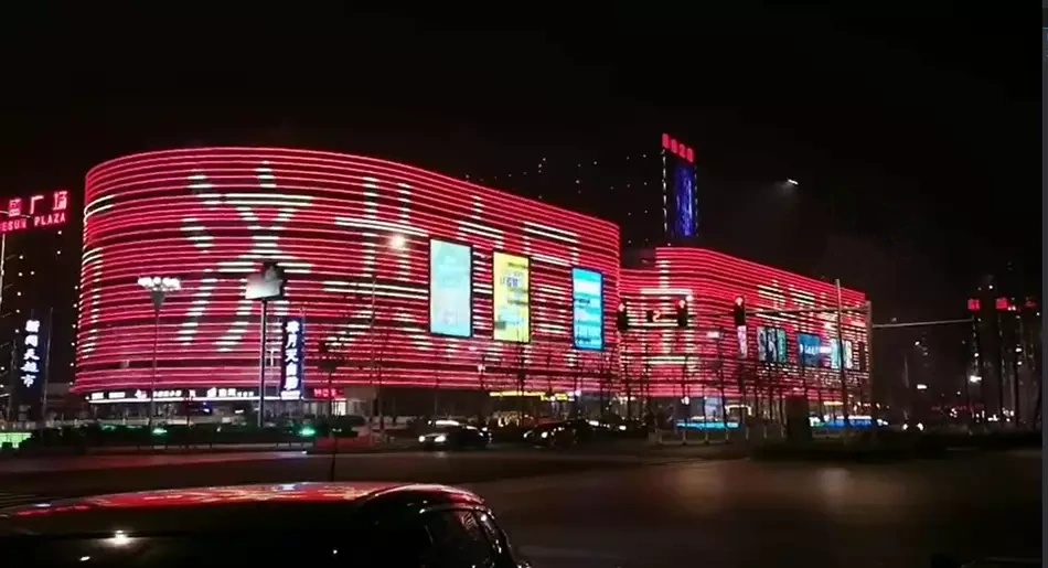 整個項目從設計、預算、燈具生產、施工指導、調試都由上海景睿照明團隊完成。樓體燈具彩色動態部分采用DMX512-4公分點光源,廣場正門口右手邊墻體上采用24W洗墻燈進行整體染色照明,樓體背面采用DMX512線條燈做呼應。